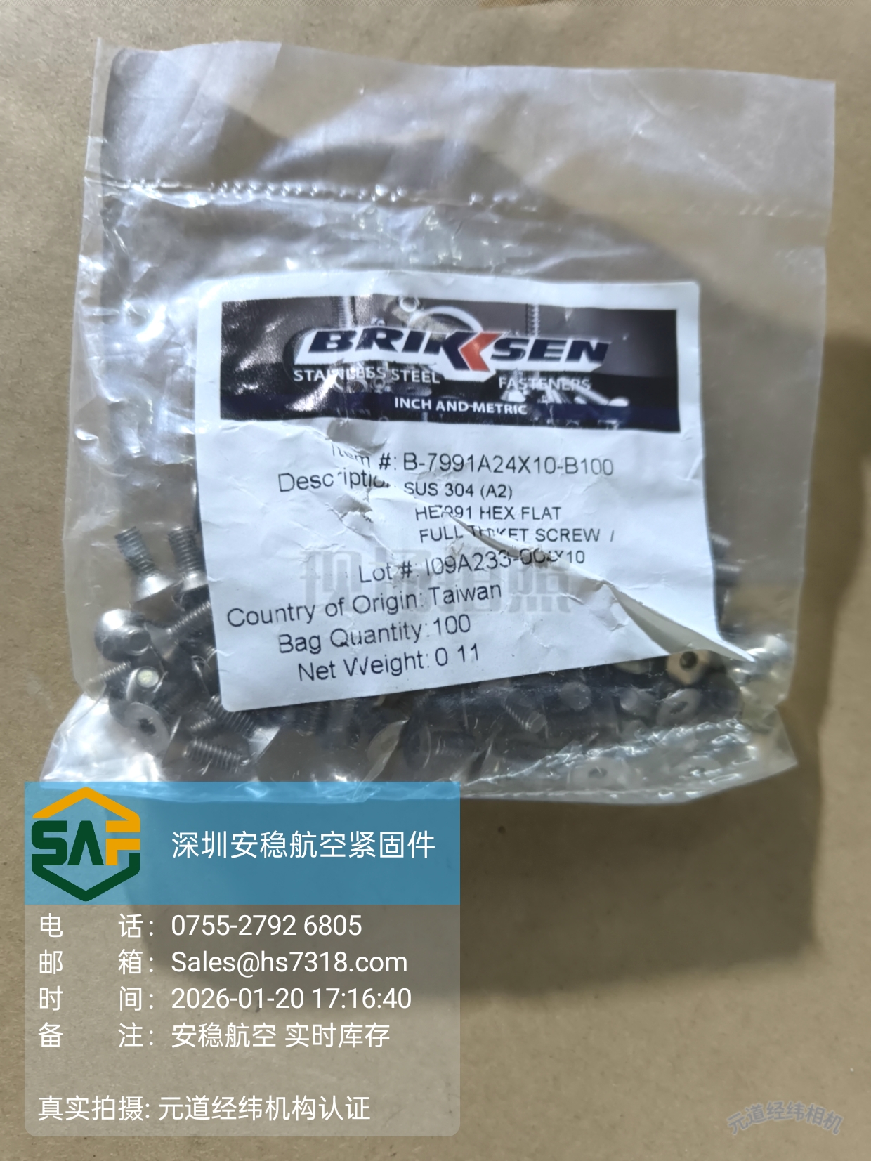 BRIKKSEN B‑7991A24X10‑B100 不锈钢沉头内六角螺丝|Sicher Aero 现货速供
